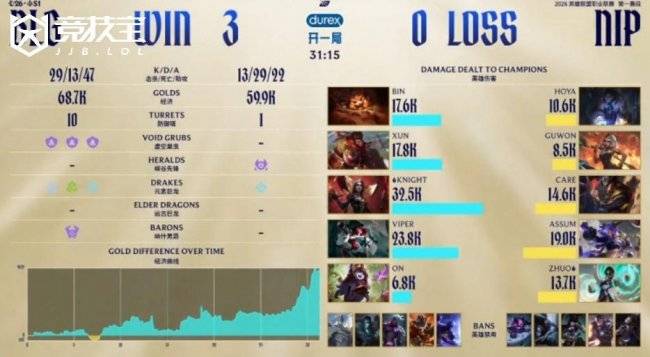 第三局BLG节奏更为凌厉。开场knight妖姬游走上路,配合Bin纳尔击杀HOYA塞拉斯拿到一血。随后中路对拼中knight完成双杀,迅速拉开差距。Xun猴子多次中路发难,Care接连阵亡,BLG经济领先2.3k。中期NIP一度反击成功,Assum芸阿娜配合Zhuo卡尔玛越塔击杀ON璐璐与Viper女枪,随后野区团战Assum斩获三杀,将经济差缩小至1k。但好景不长,Assum中路被Xun与knight瞬间融化,knight妖姬再斩双杀,BLG打出1换4,重新掌控局势,领先2.5k。后期BLG稳稳控下大龙,正面团战NIP已无还手之力。最终BLG抱团推进,一波结束比赛,3-0横扫NIP晋级下一轮。