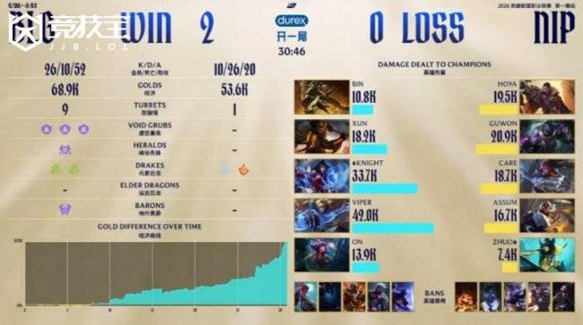 开局阶段ON妮蔻下路闪现开到两人,Viper伊泽瑞尔收获双杀,BLG打出0换2建立优势。随后野区再度交锋,BLG完成1换3扩大领先。紧接着BLG入侵野区,ON妮蔻反手大招控住Care阿萝拉,knight狐狸再添一分。中期中路团战双方2换2互有往来。关键小龙团中,Xun皇子率先换掉Assum飞机,Viper伊泽瑞尔收割战场再杀Care,BLG打出2换4,经济领先来到6k。后期大龙团成为转折点,Xun皇子再次精准锁定Assum,Viper轻松双杀,BLG打出0换4并拿下大龙,经济差接近1w。最终BLG高地团战1换5团灭NIP,连下两城拿到赛点。